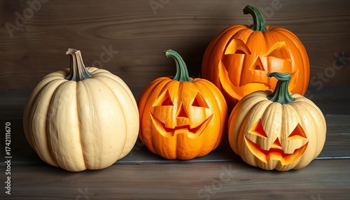 Three carved pumpkins, varying sizes, on rustic wood , orange, pumpkin