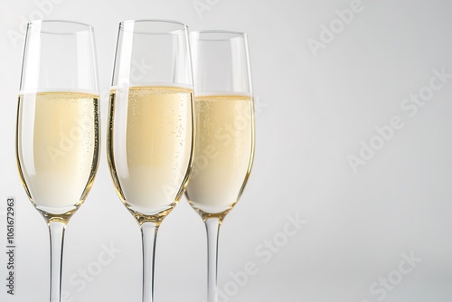 Three champagne glasses, celebration theme, bubbles.