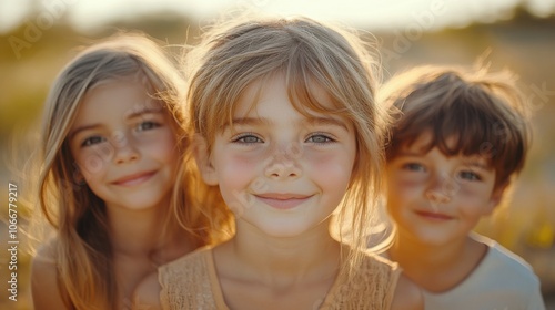 Three cheerful children smiling outdoors, golden hour sunlight, happy childhood, friendship, carefree moments, sibling bond, enjoying nature, playful innocence, warm light