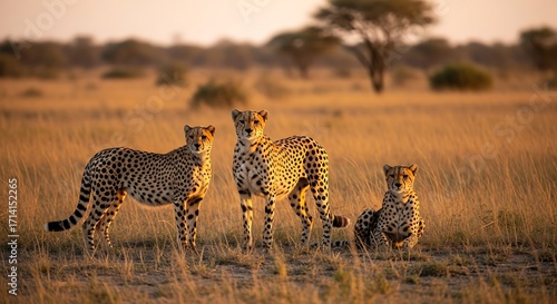 Three cheetahs stand alert in a golden savanna landscape at sunrise, showcasing the beauty of wildlife in its natural habitat.