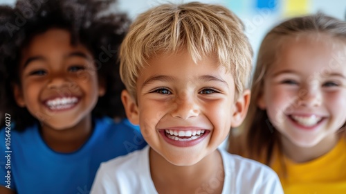 Three children are smiling brightly, showcasing joy, diversity, and innocence. They exemplify childhood friendship and happiness in a close-knit circle.