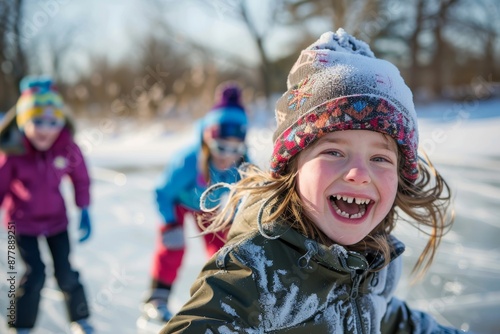 Three children, bundled in winter clothing, laugh and ice skate on a frozen pond. The sun shines brightly, and the ice is covered in a light dusting of snow