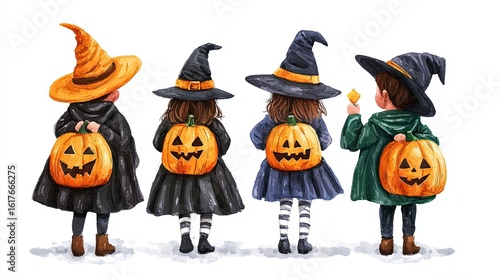 Three Children Dressed in Witch Costumes Enjoying Halloween Festivities with Spooky Atmosphere