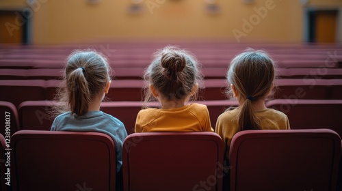 Three children sitting in theater seats with empty rows in front and blurred background.