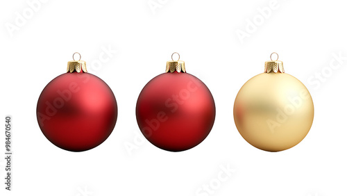 Three Christmas decorations: red and gold balls. Isolated on transparent background.