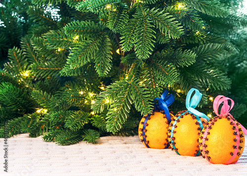 Three Christmas oranges close-up against a background of spruce branches. Oranges decorated with colored ribbons and dried carnations against the background of the Christmas tree with lights.