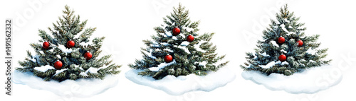 Three Christmas trees with snow and ornaments arranged in a row on a white background perfect for holiday decorations and seasonal festive themes