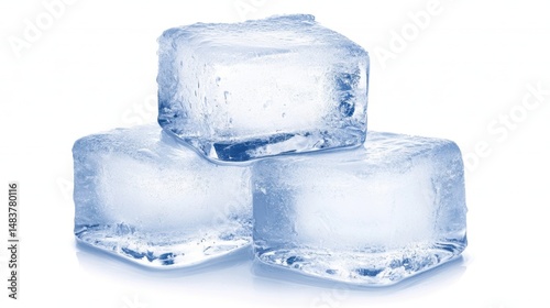 Three clear ice cubes stacked on a white background, showcasing their smooth surfaces and crisp edges, Ideal for beverage promotions, culinary presentations, or depicting refreshing coolness,