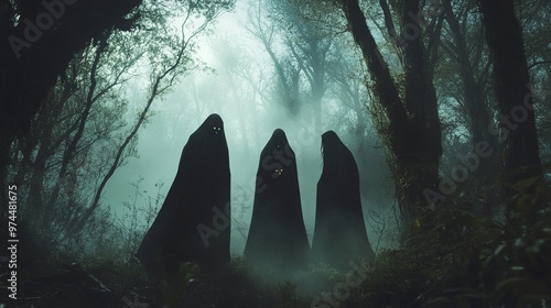 Three cloaked figures gathered around a flickering campfire in a misty forest during twilight