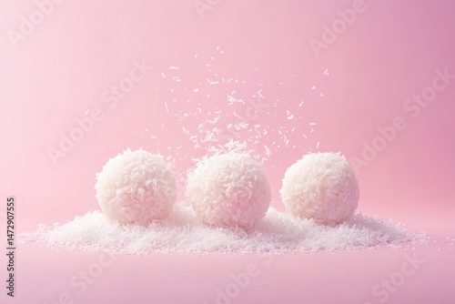 Three Coconut Balls on Pink Background with Flying Coconut Flakes