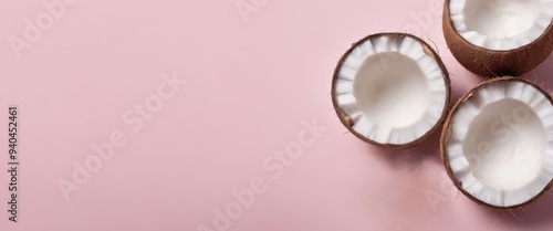 Three Coconuts on Pink Background with Different Cuts and Textur