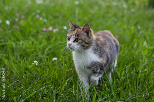 Three colored cat is standing in the lawn