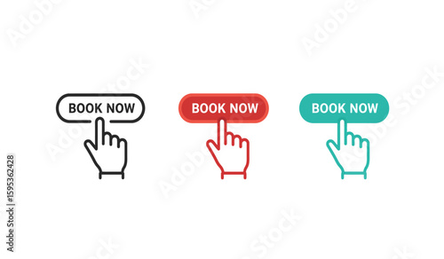 Three Colorful Book Now Buttons with Hand Cursor on White Background