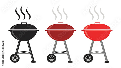 Three colorful charcoal kettle grills with smoke rising from the lids perfect for outdoor cooking and summer barbecues