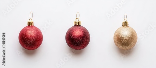 Three colorful Christmas ornaments on white.