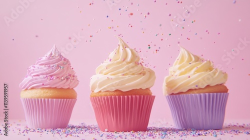 Three colorful cupcakes with whipped cream frosting and sprinkles, against a soft pink background with falling sprinkles.