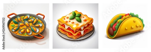 Three colorful dishes showcase global cuisine: seafood paella in a pan, cheesy lasagna, and a vibrant taco, each a culinary delight.