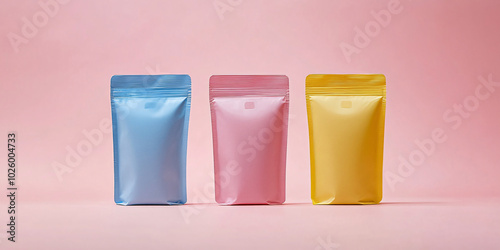 Three Colorful Packaging Pouches on Pink Background