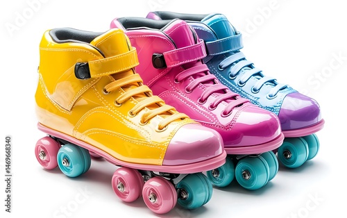 Three colorful roller skates, vibrant yellow, pink, and blue, close-up, isolated on white background.