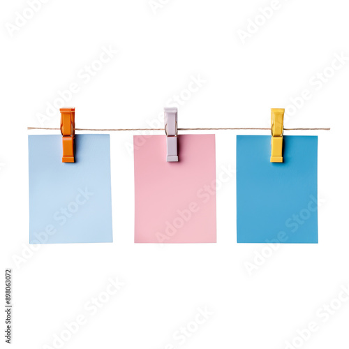 Three colorful sticky notes hanging on a string with clothespins isolated on white background. Perfect for reminders, messages, and to-do lists.