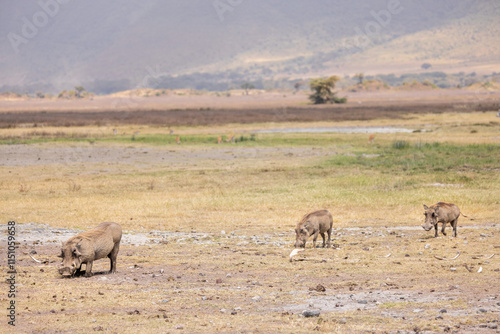Three common warthogs grazing and walking in a line in Ngorongoro Crater