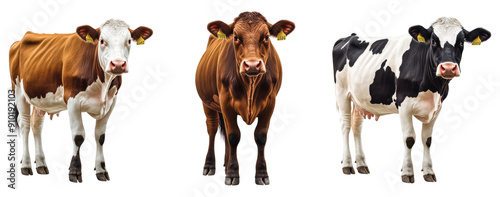 three cows in different colors (black, brown and white) isolated on a transparent background