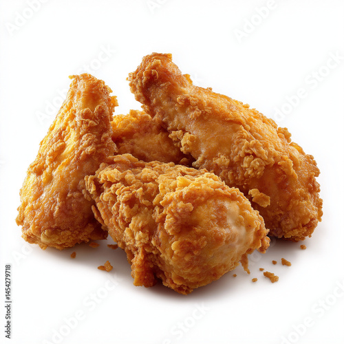 three crispy fried chicken wings with a thick, even golden breading made of large panko crumbs, fully covered with no bare spots, dense and textured coating, bright golden color, hyper-realistic food