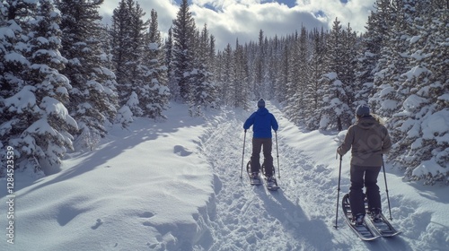 Three cross country skiers trekking through a snow-covered mountain trail. Snow-capped trees and the sky form a picturesque backdrop.