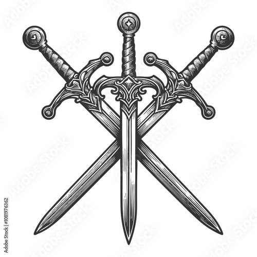 three crossed medieval swords in black and white, vintage engraving style and classic weaponry design sketch engraving generative ai vector illustration. Scratch board imitation. Black and white image
