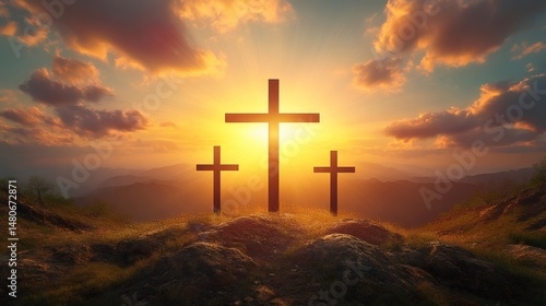 Three crosses on hilltop at sunset symbolizing faith and resurrection