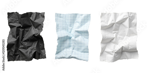 Three crumpled pieces of paper black, gridded, white transparent background