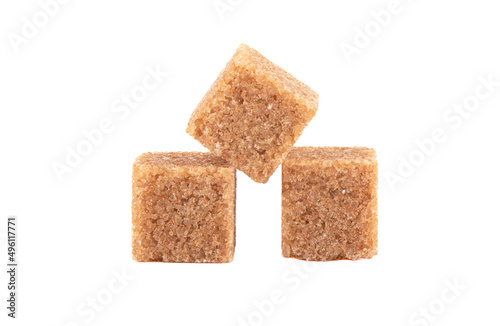 Three cubes of refined cane sugar isolated on white background.