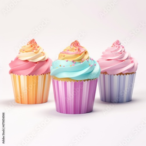 Three cupcakes with different colored frosting and sprinkles. Clipart on white background.