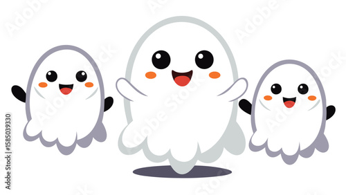 Three cute cartoon ghosts with smiling faces floating on a white background illustration scene