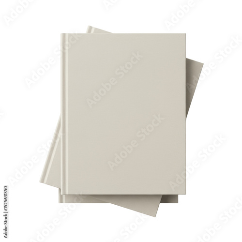 Three decorative books meticulously stacked horizontally with neutral, plain spines on a seamless transparent background, ultra-realistic product photography, top-down flat lay perspective, bright