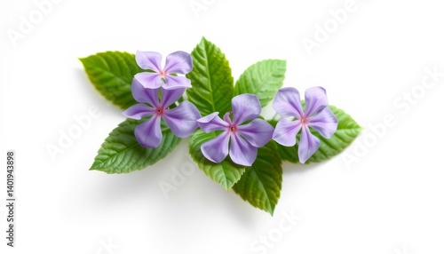 Three delicate violet blossoms with lush green leaves, isolated on pure white, freshness, blossom