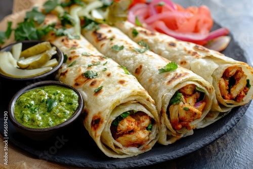 Three delicious chicken wraps served with green chutney and pickles on a black plate.