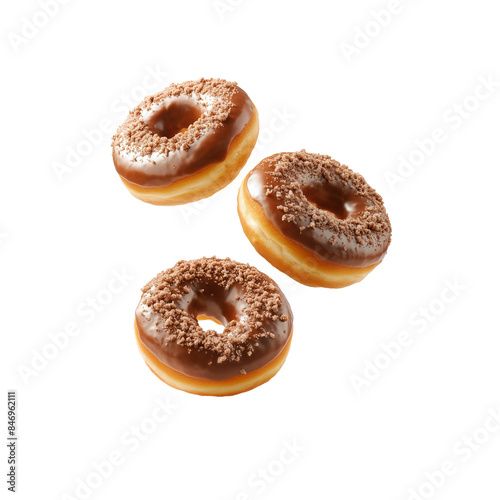 Three delicious chocolate doughnuts with sprinkles floating in the air on transparent background