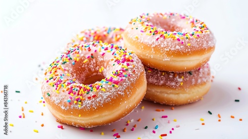 Three delicious donuts with pink icing and colorful sprinkles on a white background.