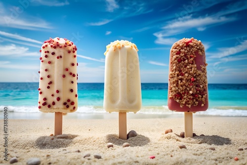 Three delicious popsicles stand on the sandy beach with a blue sky above