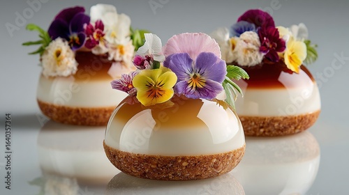 Three dessert domes on a reflective surface, topped with edible flowers