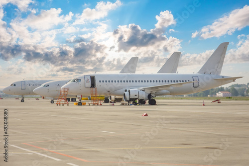 Three different types of aircraft lined up on the airport apron.