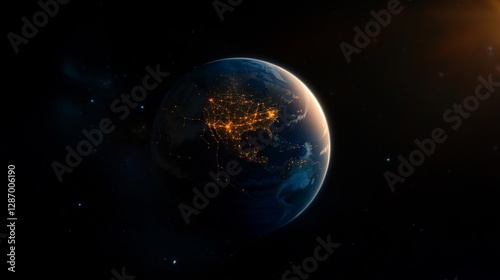 Three Dimensional Rendering Of Earth From Space With Illuminated City Lights