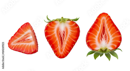 Three distinct pieces of fresh, ripe strawberry are arranged horizontally in a clean, white background isolated