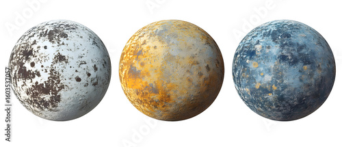 Three Distinct Planetary Spheres Against Black Background Showcasing Textured Surfaces and Varied Color Palettes Representing Celestial Bodies