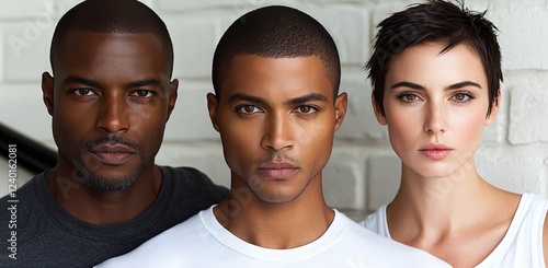 Three diverse individuals standing together against white brick wall