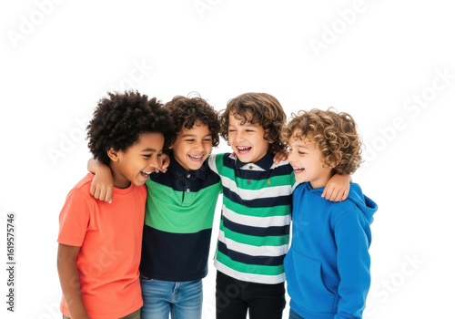 Three diverse young boys, 5-9, with curly hair and colorful shirts, huddle, arms wrapped, in peak of genuine laughter against a seamless, high-key white studio background with no shadows, pure