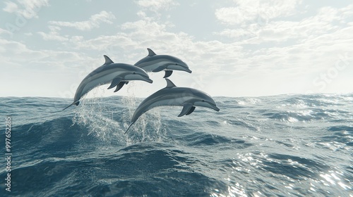 Three dolphins gracefully leaping out of the ocean on a sunny day