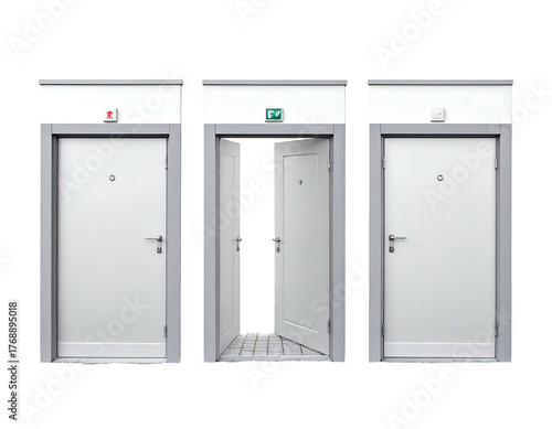 Three doors, two closed and one ajar, with a white frame and grey trim against a dark background
