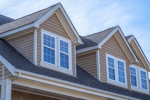 Three dormer windows on a new home with cedar shake siding. Useful for real estate, construction, and property management themes.